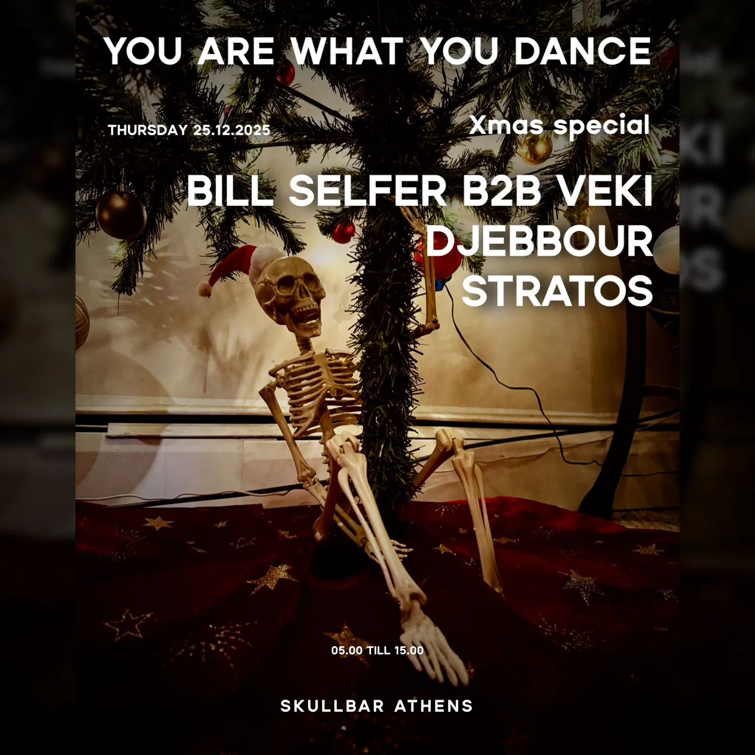 YOU ARE WHAT YOU DANCE pres Christmas afterhours w/ BILL SELFER VEKI DJEBBOUR STRATOS Thursday 25/12/2025 05:00 Till 15:00 ENTRANCE 10€ w/DRINK SE...