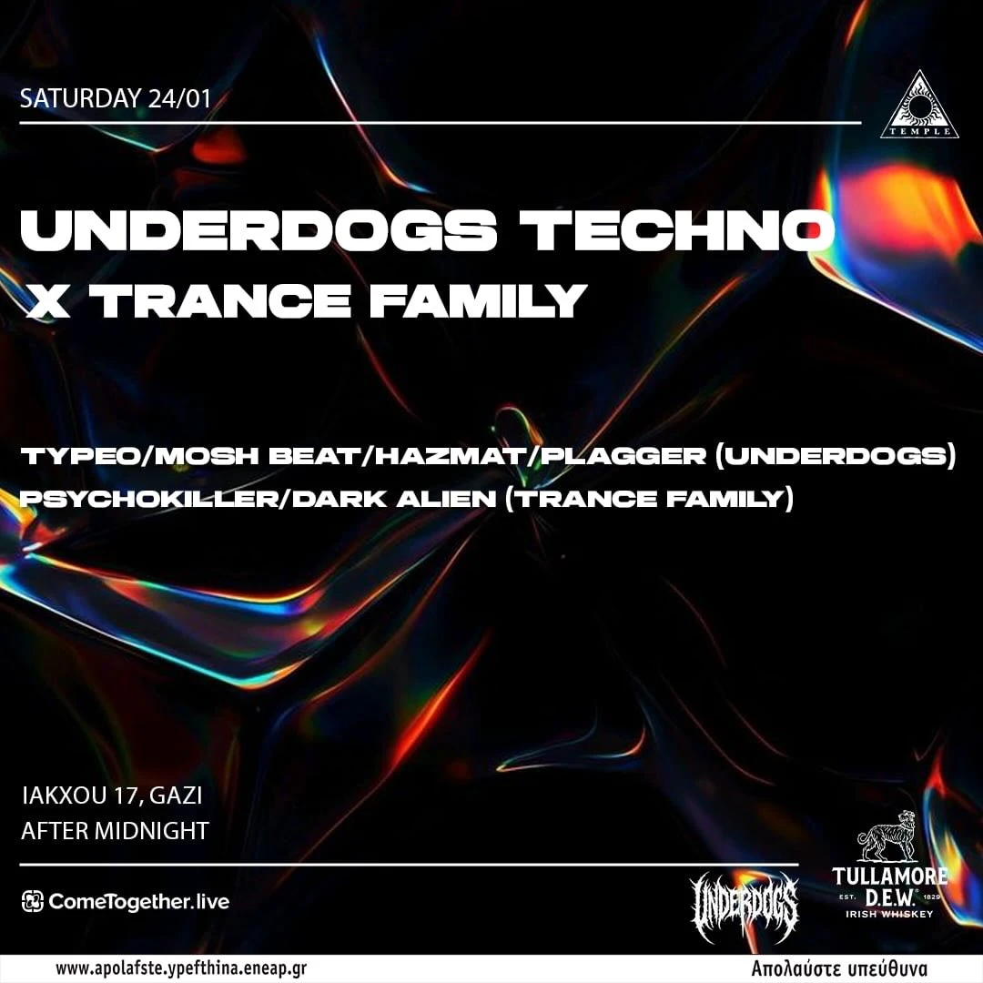 The Underdogs joins forces with Trance Family to deliver a unique rave experience at Black Temple Athens. On Decks: The Underdogs TYPEO x Mosh Beat x...